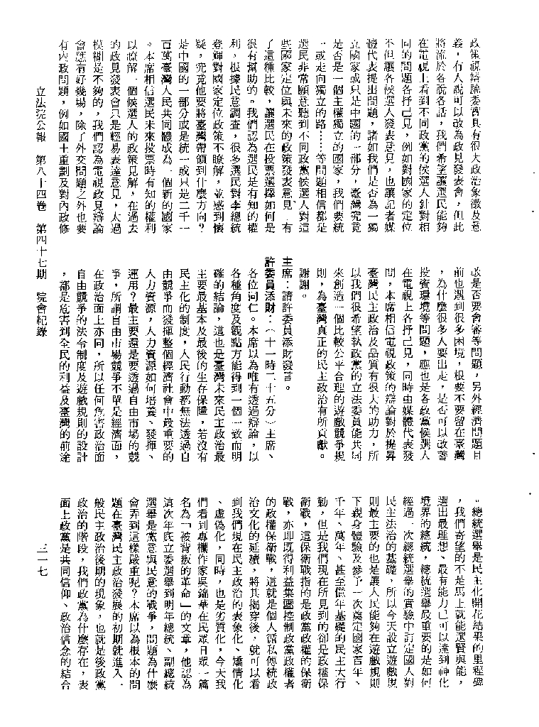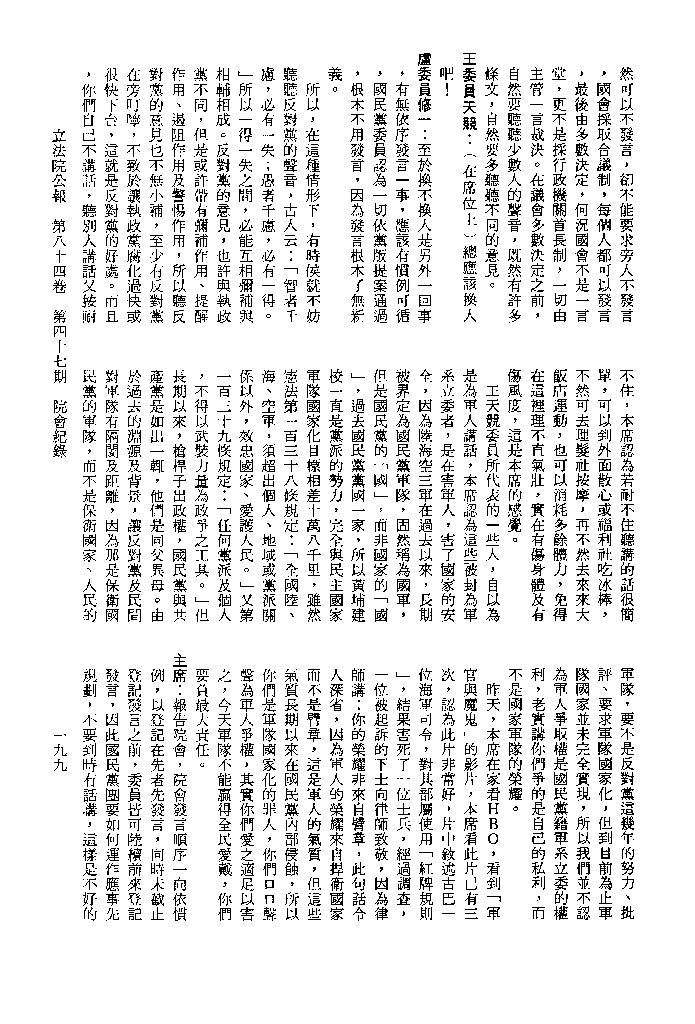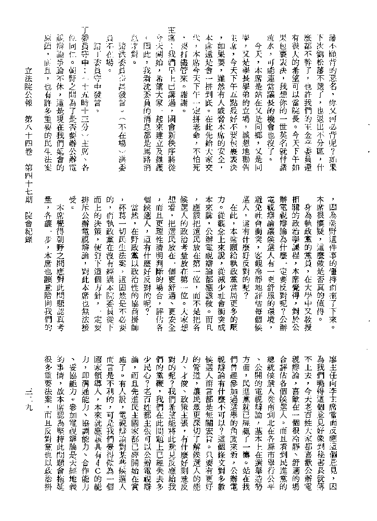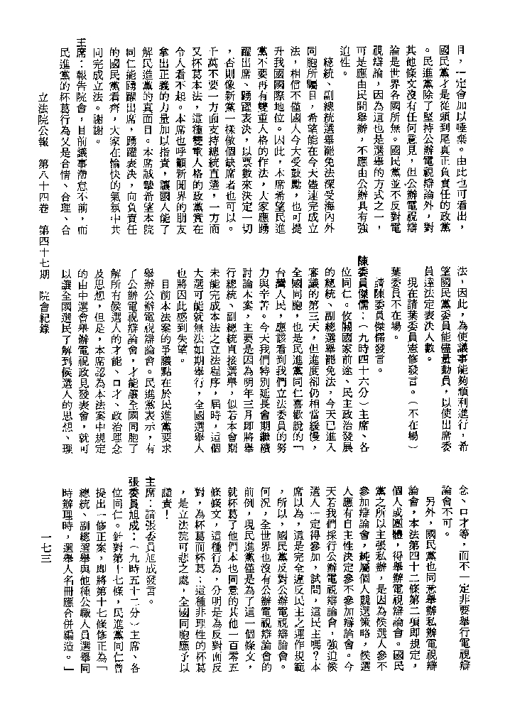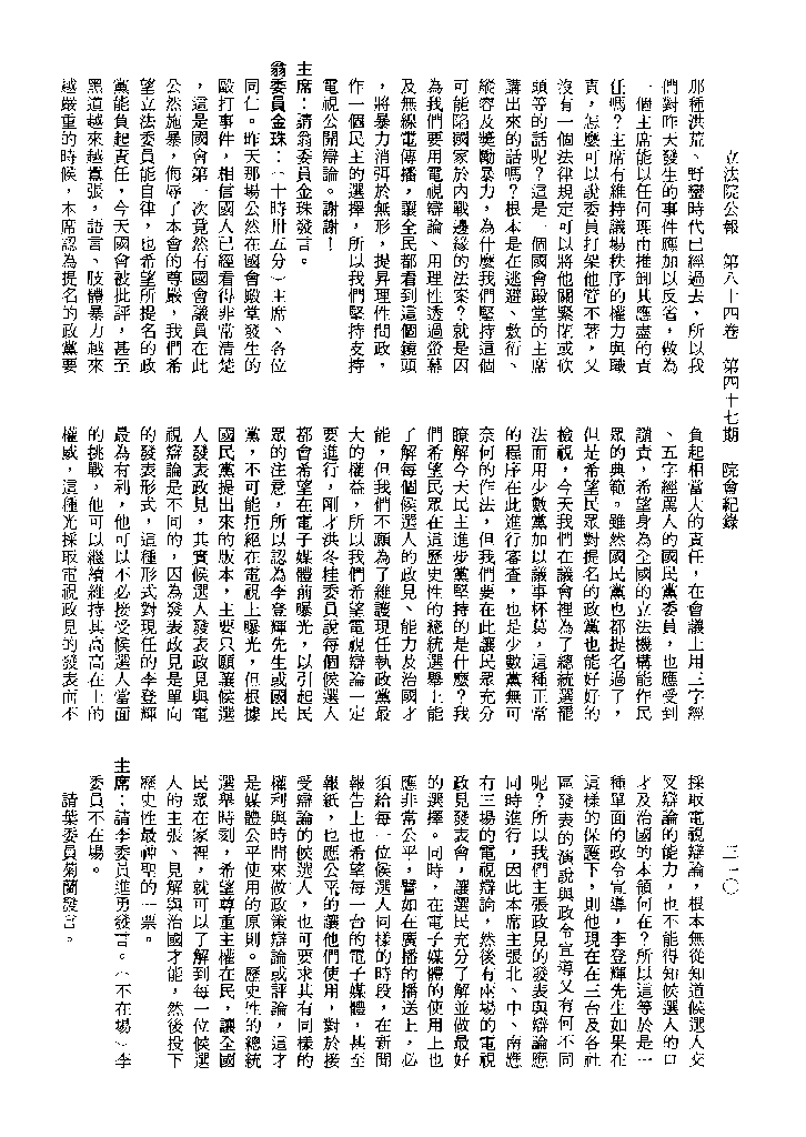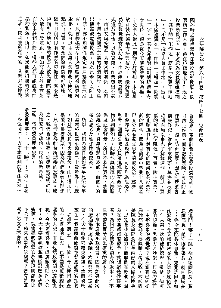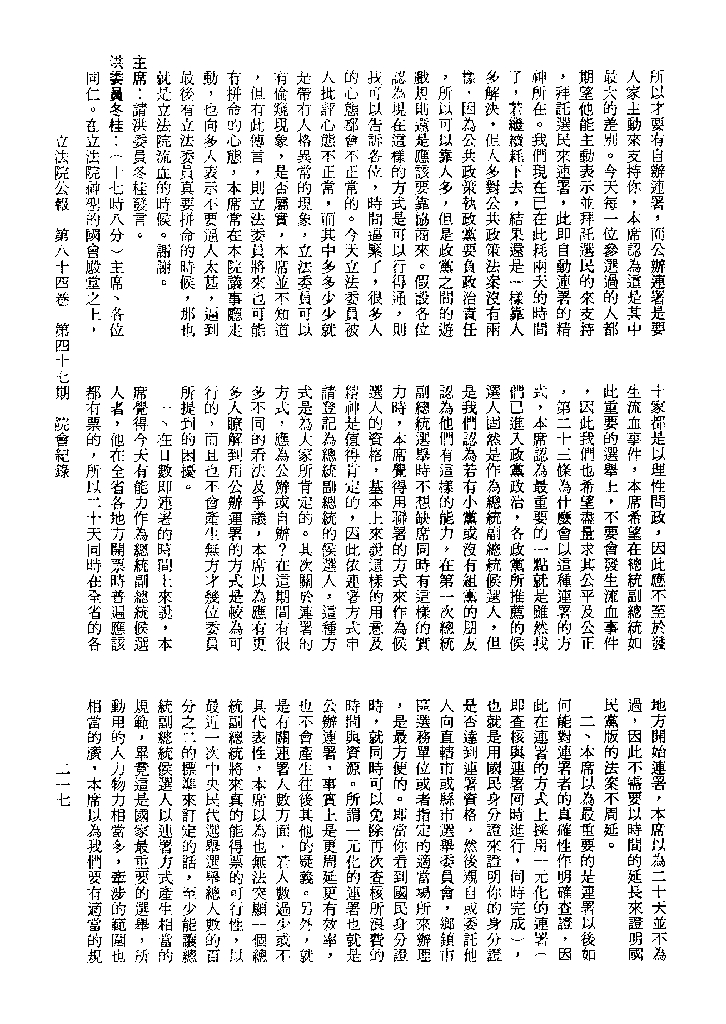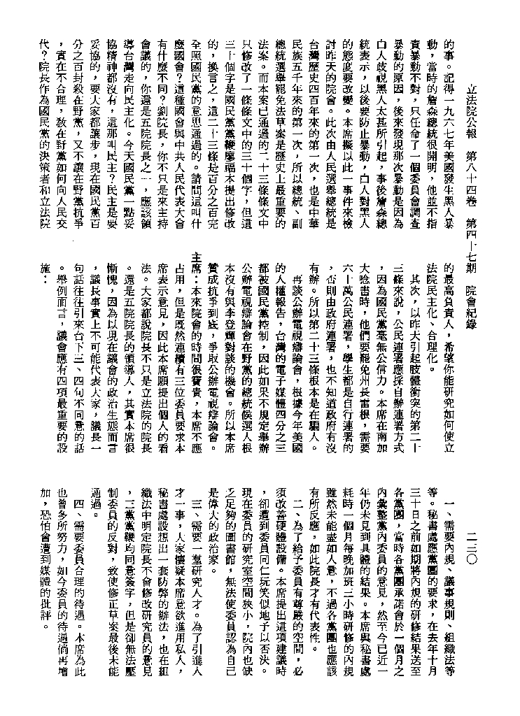 1.本案第2條以下條文,立法院第2屆第5會期第38次會議進行審議,第38次院會共包括民國84年7月14日下午、7月17日、7月18日、7月19日及7月20日上午等5個會議日。 2.由於民進黨團採取焦土策略,會議主席堅持依據議事規則逐條處理,拒絕包裹表決。因此本案第2條以下各條文的進行,按議事規則作同一模式的處理,在宣讀條文後由1位或2位委員發言,國民黨團委員即提出停止討論逕付表決之動議,停止討論動議經表決通過,該條文停止討論提付表決,此時民進黨團委員提出書面修正動議,其修正動議如獲多數支持,即照其修正動議通過,如其修正動議少數不通過,即將饒委員提案條文提付表決通過。 3.本件立法院公報紀錄第84卷,記載第38次會議5個會議日逐條討論表決之經過(第47期第87頁至第523頁)。