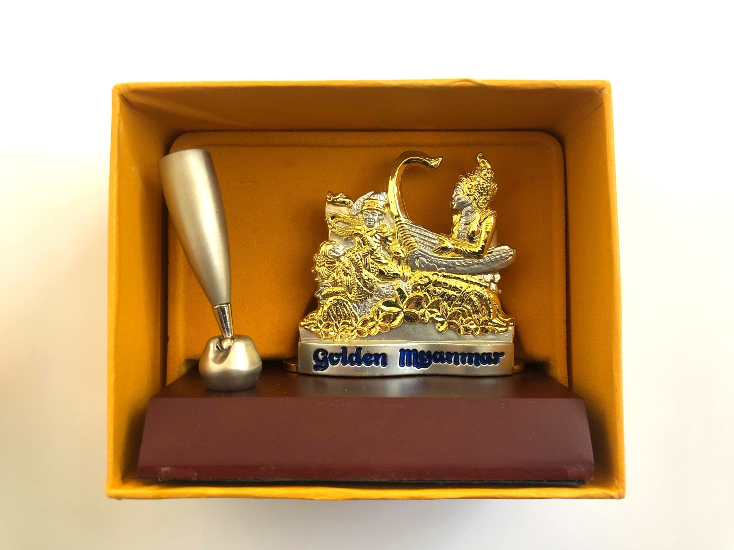 本文物為東南亞政府文官台灣研習營於2018 年 10 月 5 日拜會立法院,由緬甸成員致贈之外交紀念品。 此件雙色金屬筆座以「Golden Myanmar」(金色緬甸)為題,造型聚焦於緬甸傳統宮廷藝術。作品中,身著古典華服的人物正彈奏著緬甸國寶級樂器「彎琴」(Saung Gauk),這是一種獨特的弓形豎琴,其優雅的弧線與人物沉靜的姿態,生動展現了緬甸金屬工藝重視浮雕層次與人物神韻的特色。 緬甸素有「黃金國度」(Golden Land)之美譽,這不僅源於其豐富的礦產資源,更因為該國境內數以萬計的佛塔多以金箔裝飾,在陽光下熠熠生輝而得此稱號。文物中的「彎琴」在緬甸文化中被譽為「音樂界的王子」,它源自早期的皇家宮廷,是東南亞現存唯一的古老弓形豎琴,其樂音清澈空靈,被視為能夠淨化心靈與溝通神聖的媒介。此類工藝品常見於緬甸手工藝市場與官方外交贈禮,代表「金色緬甸」文化象徵,這件贈禮將「金色」的國家意象與象徵高雅文化的「彎琴」結合,充分傳達了緬甸以禮樂之邦自居的文化自豪感以及對雙方友誼的美好祝願。