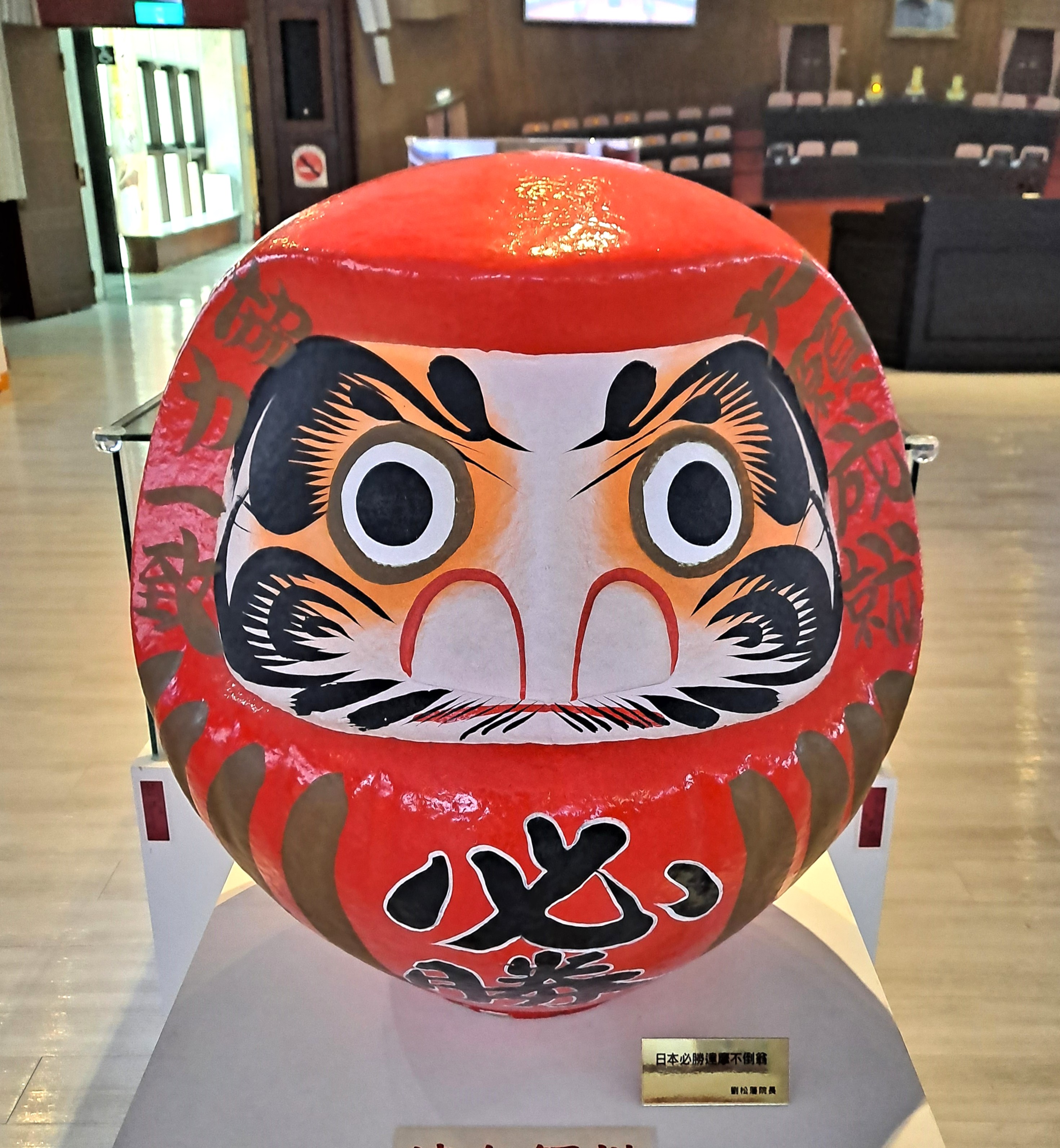 此文物為日本熊本縣玉名市市長松本虎之助(Matsumoto Toranosuke)贈予立法院院長劉松藩的「必勝達摩不倒翁」。其上題寫「大願成就、協力一致」,寓意「只要大家同心協力,就能實現共同的願望」,強調團結合作的重要性,期許人們能共同努力,克服萬難,最終達成目標。 達摩不倒翁的形象蘊含豐富的象徵意涵。習俗上,許願時會先畫上左眼,待願望實現後再補上右眼,形成一種具象的祈願儀式,後來更被延伸至政治選舉場合,候選人在參選初期會先畫上左眼,待當選後則畫上右眼,以示承諾與成就,如未當選則送回寺廟或神社「還納」或「供奉」。此外,其眉毛常描繪為鶴形,象徵長壽與吉祥;鬍鬚則似龜殼或海龜之形,寓意堅韌與安穩。鶴與龜在東亞文化中皆為長壽與幸福的象徵,使達摩不倒翁不僅承載堅毅不屈的精神,更融合延年益壽與福運綿長的意涵。此次贈禮,不僅表達對台灣的祝福與友誼,更蘊含堅持與成功的正向寓意。